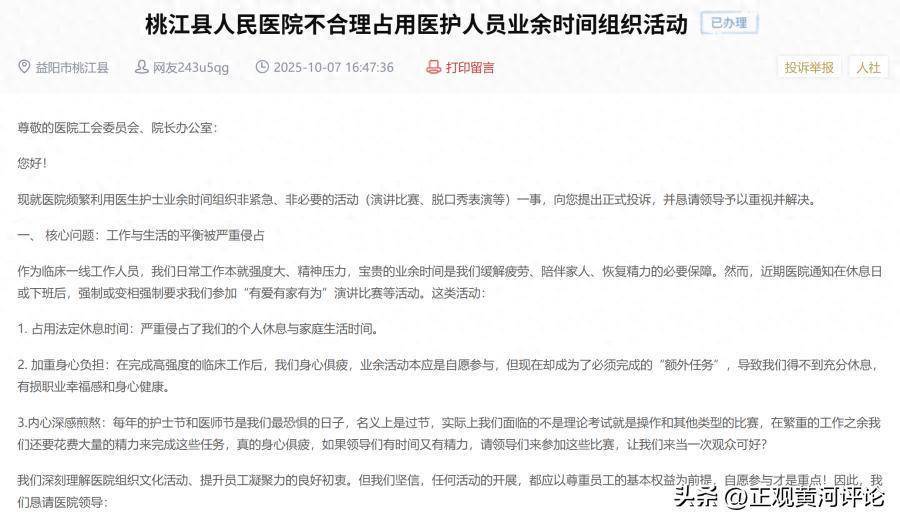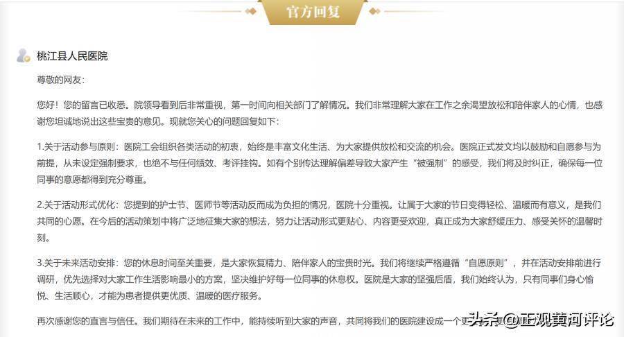 关于未来的活动安排,医院给出了“标准答案”,但为医护人员减负不能只停留在纸面上。上述投诉人还表示,每年的护士节和医师节是他们最恐惧的日子,名义上是过节,实际面临的不是理论考试就是各种比赛。联系这次的所谓“有爱有家有为”活动,没有时间何谈“爱家”?